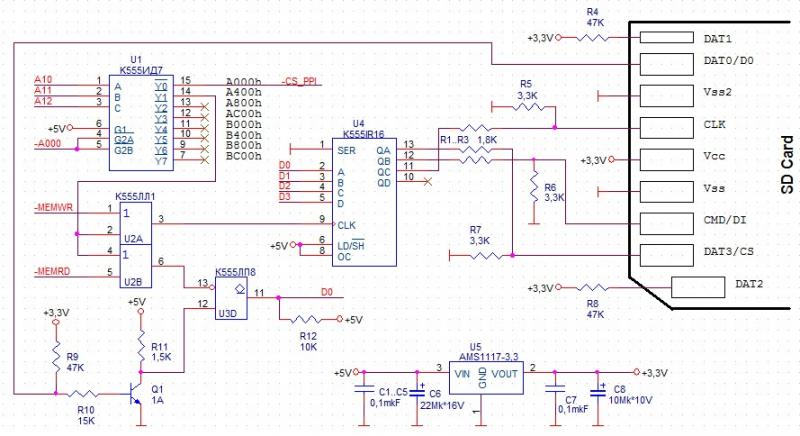 Если схема всего, кроме подключения SD карты, то во 2-м посте ссылка http://narod.ru/disk/65375399001.094.../RK86.rar.html А если именно подключение SD интиресует, то буду дома и выложу (вечером). Сейчас у меня с SD нормально читаются сектора. "Курю" FAT16 для РК. Еще думаю как вообще это будет жить. Наверно так. В мониторе добавится директива, при вводе которой будет читатся SD и выводится список программ. Можно будет выбрать нужную и запустить. Еще из прикола - я взял SD карту 2Gb (самое то для РК86 ). Её бы в 87 году с PDF файлом иметь . Вот облом то оказаться в 87 году с SD картой, но без доки на неё . Моё подключение к SD карте во вложении. С резистором R12 надо быть осторожным. Как оказалось РК86 НЕ ЛЮБИТ ПРИТЯЖКИ ШИНЫ ДАННЫХ К +5В. Когда я первоначально всю шину данных притянул к +5В через 10К (при этом у меня ещё и буфер 555АП6 стоит), были проблемы с ПДП. Я ставил контроллер ПДП КР1810ВТ37 (i8237) с соответствующим изменением инициализации ПДП - проблема исчезла. Так я выяснил, что кр580ВТ57 по выходному току не тащит эти притяжки.