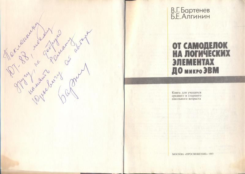 Сегодня удалось встретиться с со-автором книги "От самоделок на логических элементах до микро ЭВМ" В.Г.Бартеневым и получить автограф. Так же автору этой книги отданы в дар платы процессорного и дисплейного модуля современного ЮТ-88. Он планирует подключить ЖК дисплей и шину 1-wire. Так же возможно будет передан мне собранный ЮТ-88 из Воронежа, процессорная плата которого расположена в начале темы.
