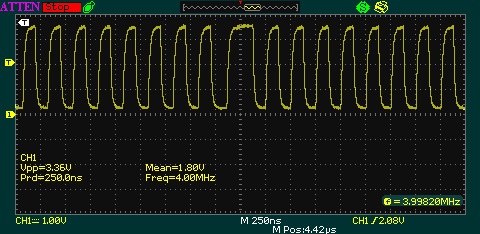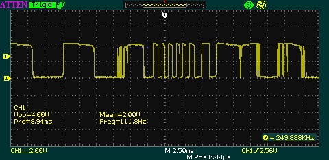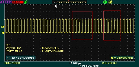 А, ну тогда это ни о чем не говорит. Если выставить на осциллографе "разрешающую способность" 200 импульсов в секунду, то он не сможет корректно отобразить сигнал с частотой 250 кГц.