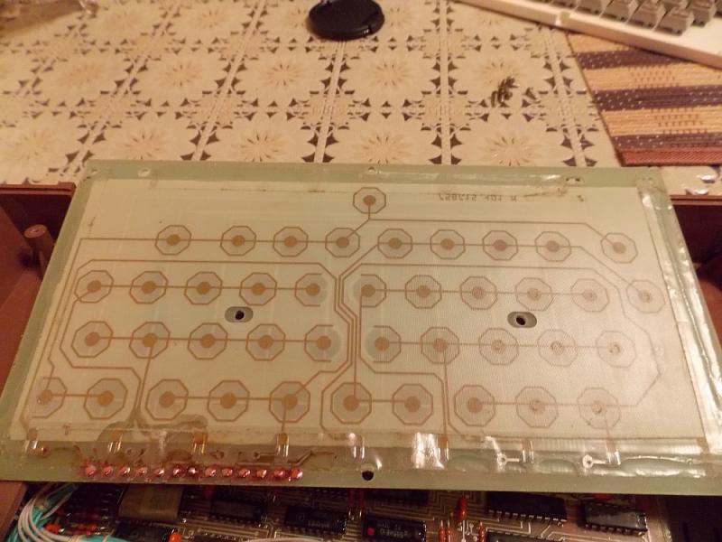 Решился, оторвал скотч с трех сторон, нашел там 3 слоя: плата, прозрачная пленка с круглыми отверстиями и пленка с дорожками и контактами и вся клавиатура, промыл все 3 слоя спиртом и ...все заработало!