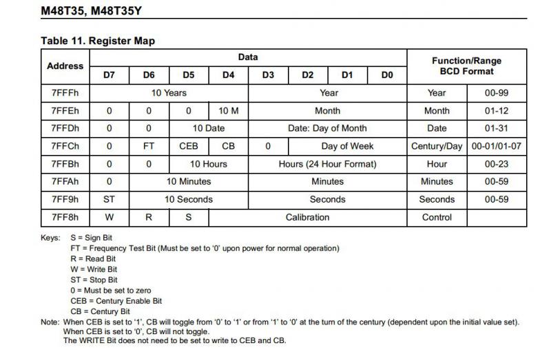 Vladimir_S, выложите, пожалуйста, содержимое последних 16 байт своего M48T35 (7FF0-7FFF) что бы часы в M48T35 запустить.