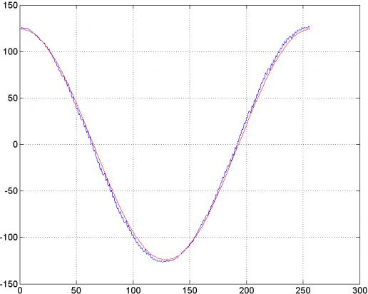 Вычисляется таблица синуса длиной 256 байт, 8-битные значения. Погрешность - +-8. На картинке красная линия - точные значения, синяя - вычисленные данной прогой.