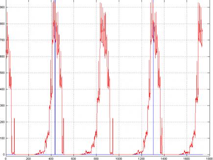 Вот я получил еще один, более информативный график по результатам логирования работы загрузчика во время загрузки экрана. В этот раз я использовал сгенерированный csw-файл, в котором времянки были выдержаны идеально. На графике - наложенные гистограммы. Синяя - это фронты сигнала магнитофона. Видно два узких пика, что свидетельствует об идеальной выдержке времянок. Красная гистограмма - это время, относительно фронтов, когда загрузчик исполнял команды IN. В идеале, если бы загрузчик смог точно подстроиться к скорости записи, красные гистограммы тоже должны были бы быть предельно узкими. На практике, как видно, они довольно размазаны, причем с перекосом влево. Загрузка происходила без ошибок, так что пики на красной гистограмме не сливаются. Но все равно, распределение оставляет желать лучшего. Теперь можно пытаться оптимизировать загрузчик с целью сузить красные пики на этом графике.