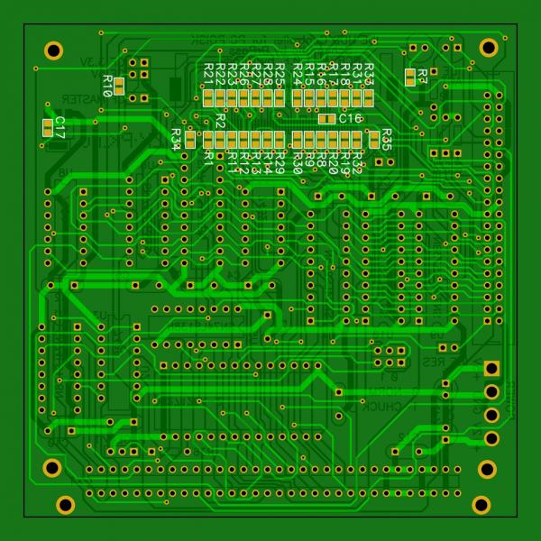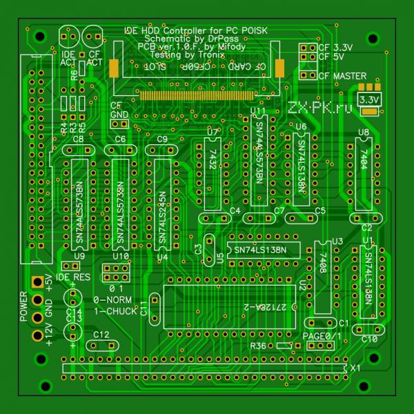 6. Правильно разведён CF разъём под распространённый коннектор CF50P. Так же добавлены ограничительные резисторы по 33Ом последовательно с сигнальными выводами CF карты. Это сделано для того, если ставить CF на 3.3В, то и сигналы у неё будут соответственно 3.3 вольтовые, в то время как с контроллера будут идти сигналы 5 вольтовые. Но тут нужно поэкспериментировать. В любом случае, их можно всегда заменить на нулевЫе резисторы. На HDD эти резисторы установлены на плате диска, есть ли они в CF неизвестно. Но опять же, хуже от них не будет. Это всё же лучше, чем опять резать плату.. Так же я изучил много схем переходников IDE to CF и все они незначительно, но отличаются подключением некоторых выводов CF на корпус. Чтоб можно было поэкспериментировать без резания платы, эти выводы CF подключены к корпусу через нулевЫе резисторы. Так же все резисторы и конденсаторы для CF перенесены на обратную сторону в виде SMD. Размер 0805, довольно крупный. Так что бояться не стоит, с пайкой справится даже начинающий радиолюбитель.