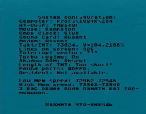 1. На первом экране отображается общий объем памяти Profi, а также версии прошивок ПЗУ, в разных областях. бейсик48, трдос и бейсик 128. Также проходит быстрый тест всего объема памяти.