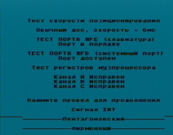 4. На четвертом экране идет тест DOS (тестировал на модифицированом трдосе 5.5 от RST7), доступность порта #FD: на старых платах, чтобы пройти этот тест нужно было нажать кнопку блокировки порта DFFD, т.к. тест вылетал с разными ошибками и артефактами в различные области ПЗУ, чаще в бейсик 48, теперь всё работает четко, как и должно. И соотв. работают все программы, которые переключают страницы по #FD, в том числе и из RAM-DISK`a. О кнопке блокировки порта DFFD можно забыть, хотя я и оставил её в виде джампера на плате. Тест музыкального процессора тестирует три канала первого АУшки, о втором к сожалению он не знает...