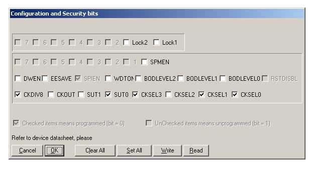 У Пони насколько помню - все биты "наоборот". У тебя как раз включен делитель CKDIV8 и установлены CKSEL на внутренний генератор, как я и думал