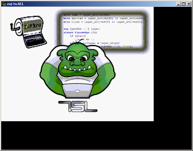 - 2 версии: для 6912 - без дитеринга и цвета - тупо старший бит зеленого канала, для TS-Conf - 256 цветов на экране, формат цвета RGB 3:3:2, тоже без дитеринга, вполне смотрибельно,