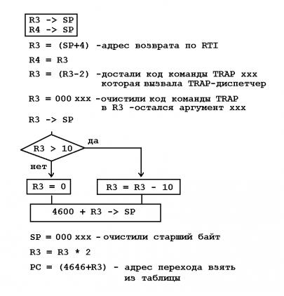 000010-R3 будет меньше, если R3 больше восьми, т.е. для номеров функции 8 и меньше будет вызвана функция номер ноль (хотя в стеке будет передан первоначальный номер). Иначе вычитаем 8, кладём в стек байт из таблицы по адресу 004600, очищая при этом старший байт в стеке, чтобы не мешался (судя по тому, что полученное число добавляется потом к адресу возврата, это количество аргументов после команды TRAP). Далее сдвигаем номер функции влево, т.е. умножаем на 2, чтобы получить смещение в таблице адресов функций. После чего вызываем функцию по адресу из таблицы 004646. После вызова достаём из стека количество аргументов и добавляем к адресу возврата. Выкидываем из стека реальный номер функции и восстанавливаем регистры. Всё, возврат из прерывания.