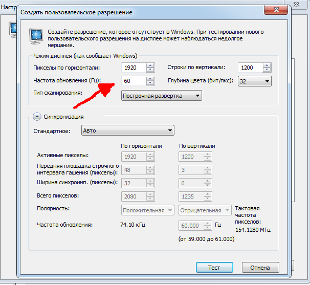 (скрин слева), там уже крутим (если надо) разрешение и герцовку (скрин справа). Ставим 50, Тест, если монитор показывает - сохраняем.