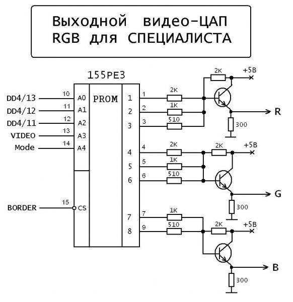 Раз уж для цвета уже используют PC7, PC6 (это А.Волков) и PC4 (это Иванов/Медведков), то сама напрашивается мысль использовать для цвета всю тетраду PC4...PC7. То что PC5 истрачена на звук - не волнует (PC7 тоже уже был занят на "TAPE OUT"). Можно поставить тумблер или DIP-конфигуратор.
