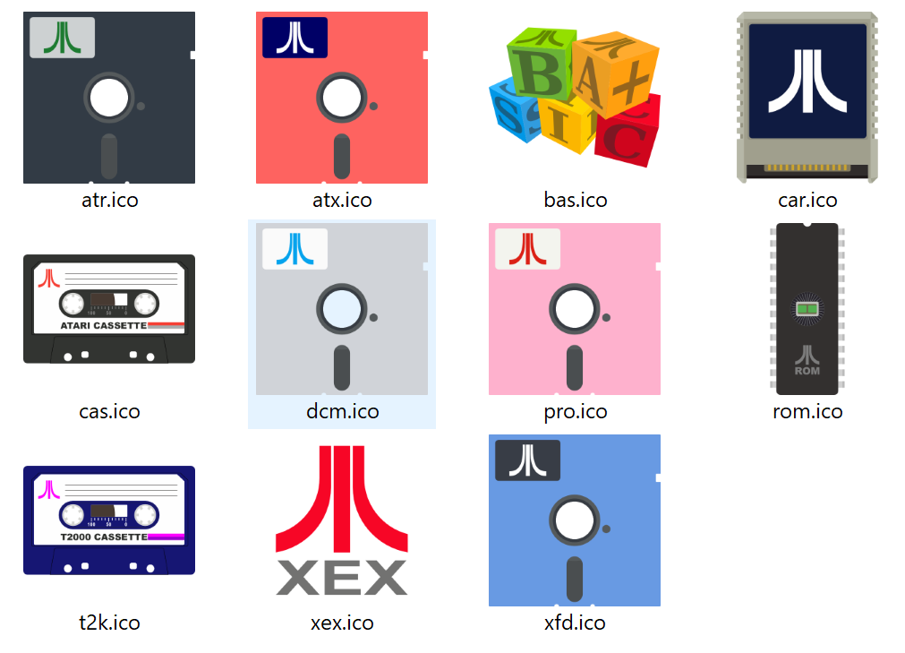 Этот файл будет использовать значки из папки "icons" и текущий путь для сопоставления amr64.exe со следующими типами файлов: atr atx bas car cas dcm pro rom xex xfd t2k.