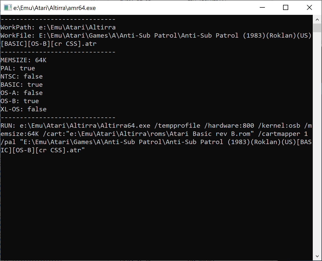 После этого формируется строка запуска с аргументами эмулятора, и всё это передаётся в altirra.exe.