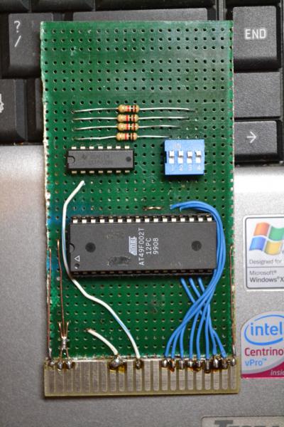 Вот фото с флешкой 2Мбит (256КБ) внутри которой 16 игр по 16КБ, переключаются установкой 4-х перемычек в инверсном двоичном коде. Например 1111 - игра номер 1, 0111 - номер 2, 1011 - номер 3, 0011 - номер 4 и так далее. Если на картридж вывести кнопку ресета и вместо перемычек установить двоичный счетчик, то будет вообще сказка. Правда есть одно неудобство - флешку нужно шить на программаторе. Схему попозже нарисую - сейчас нужно поработать.