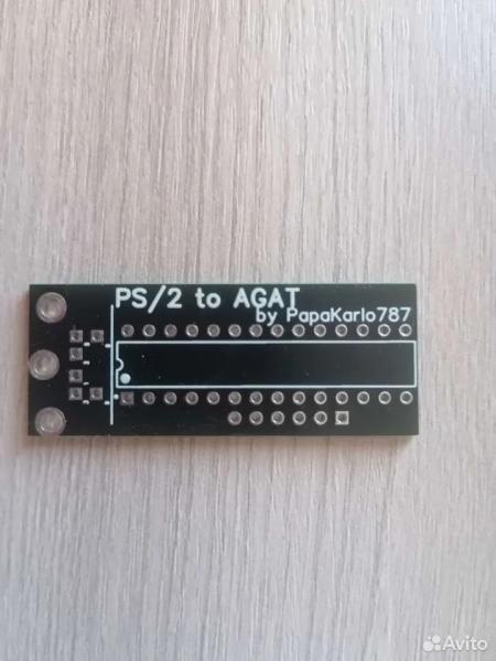 На плате надпись "PS/2 to Agat by PapaKarlo787". Никакого указания на реальных авторов. Увидев это объявление, я позвонил продавцу и сказал, что он поступает нехорошо, продавая чужие разработки без разрешения, после чего завершил разговор.