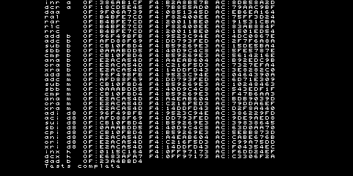 Тесты запускаются из доса, но вывод на экран весь свой. По окончанию зацикливаются (на клавиши не реагируют, надо рестартовать).