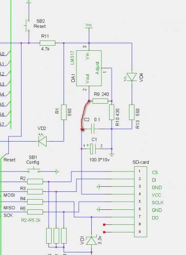 Начал собирать цепь питания SD-карты на LM317, формирующая напряжение 3.3V и нашел ошибку в схеме, надо править...