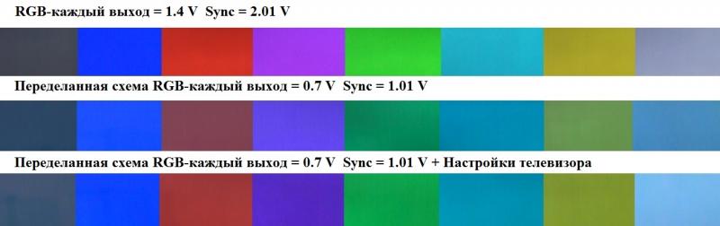 Вопрос. Кто разбирался в SCART-контроллерах на современных телевизорах. Можно ли сжечь контроллер (телевизор) при продолжительной работе с превышением размах сигнала? Или как мне привести цвета в соответствие?