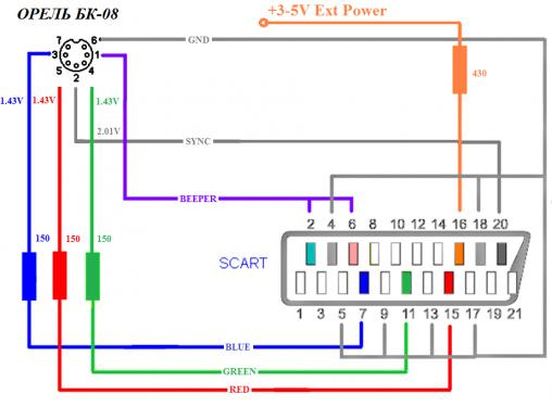 Нашел схему подключения к SCART с внешним 5V блоком питания (см. вложение).