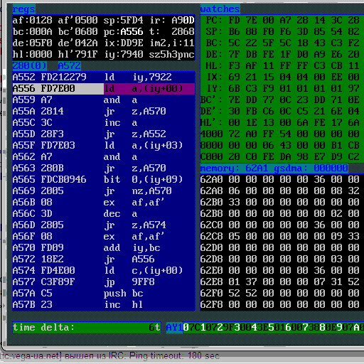 Конечно, было несколько беспричинных глюков, но за декабрь ни одного не встретил... Больше всего подозрений вызывает эта процедурина и вероятный INT во время выполнения:Код:; in : A = page to set. RET will be through bstRet, with restoring previous page bankSR ex (sp),hl ; SP:*,HL ld (bsrJmp+1),hl ld hl,(curBank-1) ; H = curBank ex (sp),hl ; SP:*,curbank push hl ; SP:*,curbank,HL call setBank ld hl,bsrRet ex (sp),hl ; SP:*,curbank,retadr bsrJmp jp 0 bsrRet ex (sp),hl ; SP:*,HL ; H = curbank push af ; SP:*,HL,AF ld a,h call setBank pop af pop hl ret