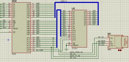 Для наших простых 8и биток нужен простой и современный интерфейс для обмена файлами. SD карта на эту роль подходит очень хорошо, а так как размеры файлов у нас максимум пару десятков килобайт, то можно не очень сильно смотреть в сторону скорости загрузки, если такие 'большие' файлы будут грузиться ~20с. В результате у меня родилась вот такая схема. Используется схема подключения РОМдиска на портах ВВ55 (применима на РК-86, ЮТ88, Орион, Апогей). Делается один разрез к А14 ПЗУ диска и зашивается соответствующая прошивка. Я не хотел использовать дополнительный корпус, мультиплексор, для отключения выхода РОМдиска и подключения выхода карты, а выход карты завел на адресный разряд (А14) ПЗУ. Однако это повлекло уменьшение в 4 раза размера РОМдиска, что при появлении SD карты, мне кажется не существенным. Образ РОМдиска собирается из 4х фрагментов по 16КБ, где первый и второй фрагменты дублируются, третий фрагмент забит нулями, а четвертый FF_ами. Когда идет работа с SD картой на ножке А15 ПЗУ появляется 1 и на выходе РОМдиска будет тот уровень, что присутствует на ножке А14, те выходные данные с карты. В качестве программной поддержки используется SDOS (в базе которой код b2m, который тут ранее в этой ветке уже обсуждался) с доработками позволяющими использовать современные SDHC карты (те больше 2ГБ, но отформатированными только в FAT16), и позволяющими записать на карту в существующий файл данные из памяти. В качестве держателя SD карты можно использовать платку с Ali или сделать ее из переходника SD->microSD, с использованием резисторных делителей для преобразования 5В уровней в 3В уровни карты. Во вложении файлы для эмулятора b2m для ЮТ88. Чтение SDOS из РОМдиска и запуск ОС:
