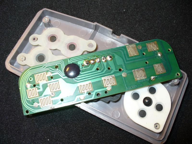 Вот, надыбал джойстик от денди. Кабель был отрезан, прям на плату были припаяны какие-то провода (МГТФ) к кнопкам, тоже отрезанные болтались. Видно что-то кто-то колхозил. Для проверки подключил кабелем от работающего джойстика - увы, капля оказалась мертвая.