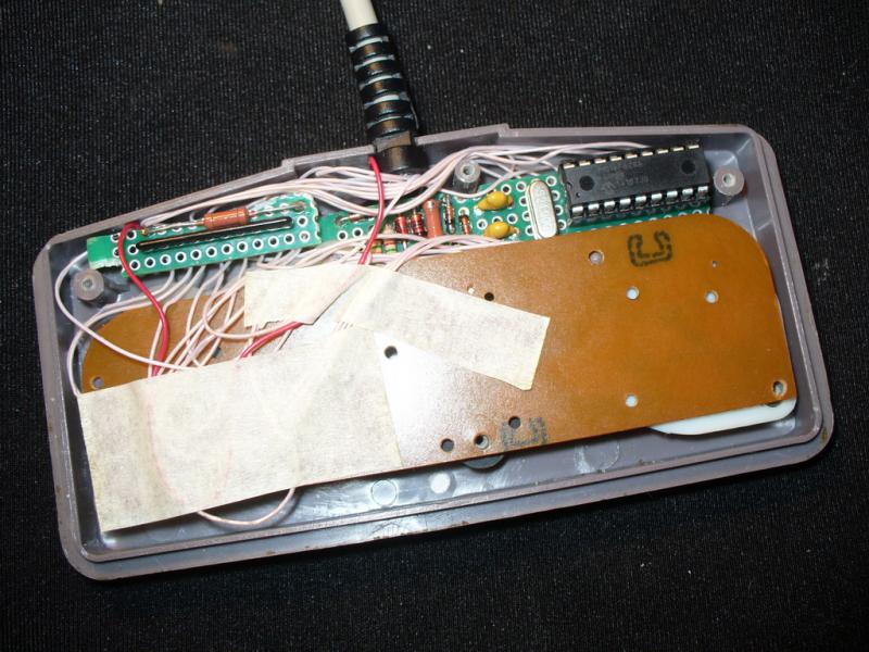 Для PIC немножко побольше обвязки нужно, поэтому смастерил небольшую платку, где распаял всю рассыпуху. Хорошо встала в правый угол джойстика. В левом углу будет небольшая платка с резисторной сборкой (10к, подтягивающие к питанию) для кнопок.
