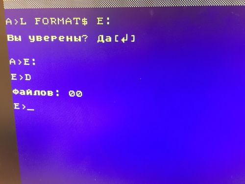 Посмотрел исходник FORMAT'а, оказывается нет проверки успешности форматирования. Сначала выполняется определение наличия RAM-диска, после чего в диск записывается структура каталога (DIR+FAT) и "успешный" выход. Определение делается следующим образом: ЭД переводится в режим "чтение RAM", читается байт по адресу 0000h нулевого банка, если там не 0C3h, значит RAM5 есть. Из чего можно сделать следующий вывод: если м/сх СОЗУ неисправны или вообще отсутствуют, то детект пройдёт успешно, форматилка отработает без ошибок, а ОС разумеется сообщит о неготовности диска - что и видно на скриншоте.