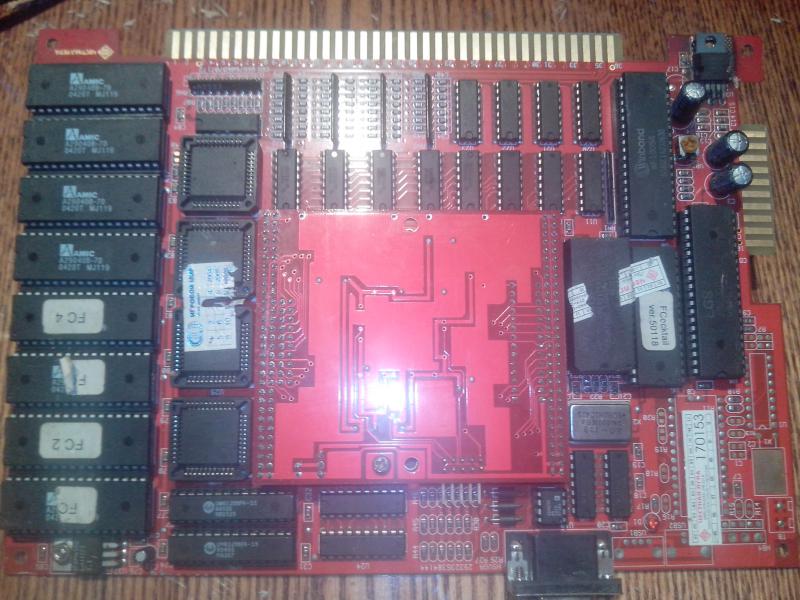 Эта платка, наверное что-то вроде процессорного модуля и статика наверное вместо кэша. Она вставляется в плату побольше соответственно, на которой полно ПЗУ разных ОЗУ немного вроде, не помню, ещё 4 CPLD epm3032, VGA выход даже.