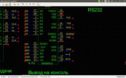 По схеме видно, что на тактовый вход идет CPU_CLK 1,8432МГц, на тактовые входы RxC и TxC - деленное на 6. Микруха подключена портом #80(81).