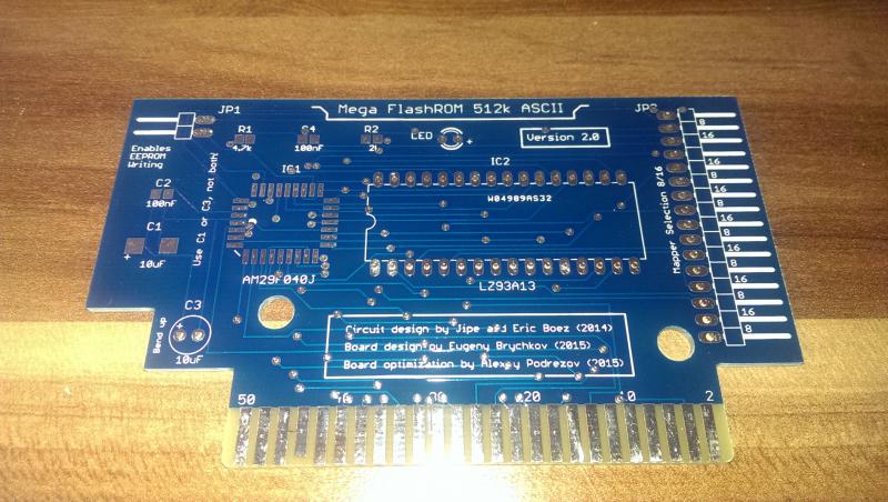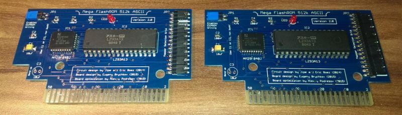 Приехали платы моего клона Flash Rom картриджа на 512кб с маппером ASCII которые сделал Эрик Боез. Я немного поменял расположение элементов, добавил возможность установки smd или обычного конденсатора, светодиод, а также кучу джамперов, которыми можно выбирать тип ASCII маппера (8 или 16 бит). Вчера собрал два картриджа и потестировал на разных играх в двух режимах. Все работает как надо. Кому нужны герберы, обращайтесь.