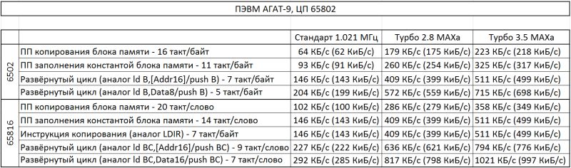 Очень интересная таблица, показывающая хотя бы в частном случае разницу между 6502 и 65816. Да и 6502 – тоже достаточно загадочный для меня, например, процессор. Известно, что по средней скорости в тестах при частоте 1 МГц он вполне сравним с 8080 на 2,5 МГц (часто даже быстрее) или даже с Z80 на частотах больше 3 МГц. А вот копирование и заполнение блоков памяти – слабая сторона 6502, так как нет ни спец. команд для этого (как у Z80), ни полноценных стековых операций, использующих всё адресное пространство, а не только нулевую страницу.
