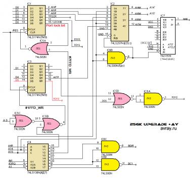 После этого подумал, как бы расширить до 1024 и сформировать МА9, понравилось расширение по схеме Scorpion 1024, т.к. требовало минимум изменений в схеме, решил тупо в лоб, взять D6,D7 с 1FFD и бросить на 10 и 12 ноги КП2, на 11 и 13 подав GND, но ничего не получилось, 256 как было так и осталось, потом еще и /CAS начал глючить, короче вернул как было, 256к.