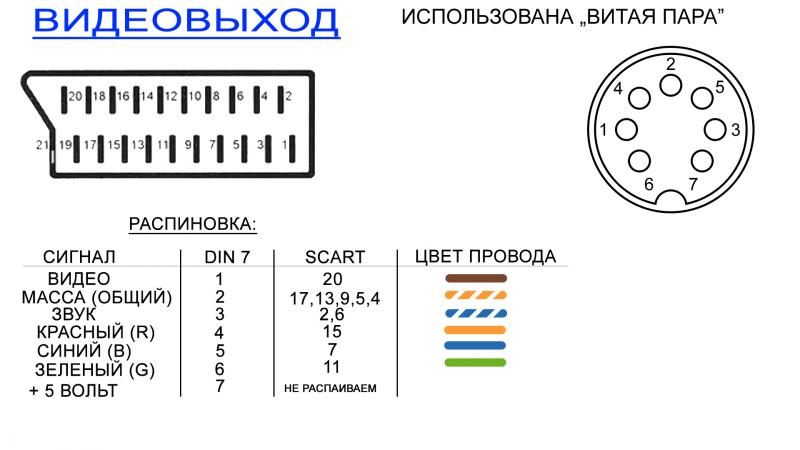 Прилагаю также распайку проводов: Видеовыход - DIN7 на SCART (проверено на телевизоре, который поддерживает RGB через SCART), Аудиовыход - DIN5 на MiniJACK (можно загружаться с плеера или с любого достаточно громкого источника звука)