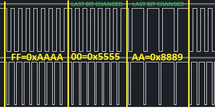вот кстати из таблицы, видно что 0xFF = 0xAAAA это не 8 импульсов а !16 смен уровня сигнала, то есть 16 мпульсов на выходе дисковода, о чем я и говорил, вернее 15, нужно учитывать последний бит предыдущего байта