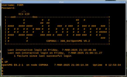 Среди прочего выяснено, что до VMS V3.x включительно RTEM не требован никакого дополнительного софта - работал сразу.Код:[form@dev ~]$ ssh vms@pdp-11.online Trying 172.31.10.12... Connected to vaxvms.home.lan. Escape character is '^]'. Welcome to OpenVMS (TM) VAX Operating System, Version V7.3 Username: RTEM ,;, O(o o)O +---ooO-----------Ooo----------------------------------------------+ | # # # ## # | | # ## ## # | | #### #### #### # # ### # ### # ### # ### ### | | # # # # # # ### # # # # # # # # # # # # | | # # # # # # # # # # # # # # # # ##### | | #### #### #### ### ### # ### # # ### ### # # # | | # # ### | | # # XPEH:: VAX/OpenVMS V7.3 | +------------------------------------------------------------------+ Last interactive login on Friday, 7-MAR-2025 04:10 RTEM-11 (VAX/VMS) V01.00F RT-11FB V05.07 .SET TT QUIET ?DATE-I-Time source: VAX/VMS ?DATE-I-Date & time: 7-MAR-2025 21:27:45 .