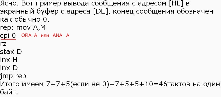 Итого имеем 7+7+5(если не 0)+7+5+5+10=46тактов на один байт.