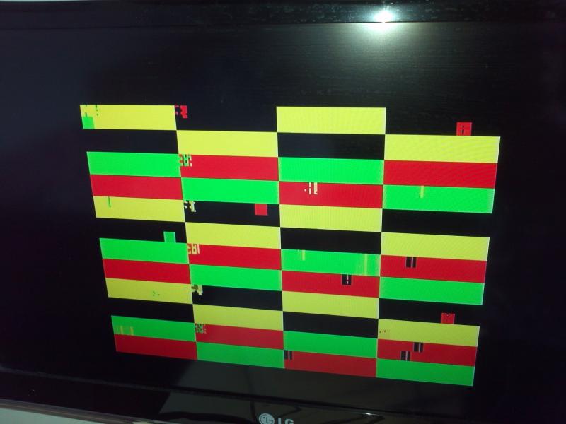 Всем привет! Имеется пентагон 128 стандартный и ранее даже рабочий. Но слегка поглюкивавший. Не было звука бипера и кнопки в одном полуряде не рабочие, там где mnbv и пробел. Причем сама клава рабочая вся, что-то с мсх внутри, я думаю. Решил поменять тм2, которая бипер выводит. После этого комп включился и показал меню, но при первом же нажатии на кнопку клавы впал в кому, в которой находится и по сей день. Что без пзу, что без проца картина одна- неправильная шахматка, то есть с мусором. Мусор всегда один и тот же и находится в тех же местах. Процы ставил разные, ставил тест пзу, тест даже не начинается, то есть проц не стартует, как я понимаю. Две шахматки прилагаю. Они разные. Вторая получается, если слегка плату придавить. Помогите мне вернуть его к жизни, жалко выбрасывать. Осцил есть, но опыта очень мало. Спасибо.