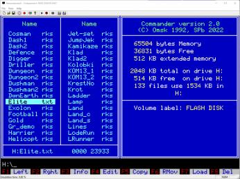 - В нортоне реализован скроллинг, чтобы можно было добраться до любого файла. Если каталог большой (на флеш-диске у меня 133 файла), скролинг подтормаживает, потому что каталог каждый раз целиком читается с накопителя. Буфер со списком файлов, отображаемых на панели (36 шт), и так килобайт занимает, тут особо не разгуляешься. Эта проблема решится с реализацией поддержки папок - не будет в одном каталоге такой огромной россыпи файлов.