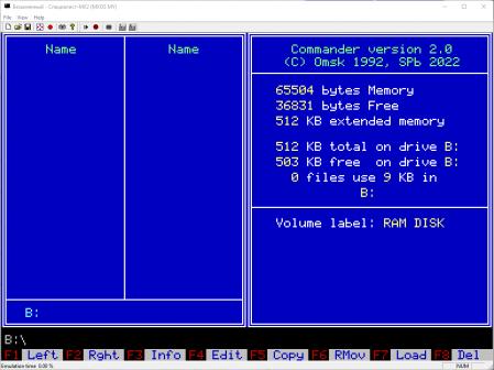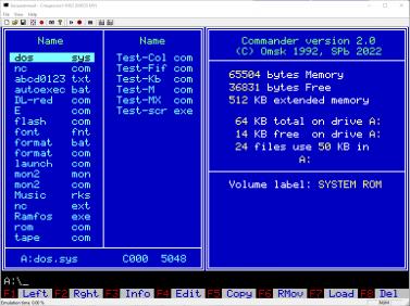 - Поменялось распределение памяти. Стандартные программы (нортон, редактор и др.) переехали на E800h, что, кстати, совместимо с Ramfos. Редактор E.COM адаптирован и слегка раскрашен. Для драйверов осталось 2-2.5 кб памяти. Кто бы написал драйвер дисковода и SD карты? Нужны, как и раньше, только три функции - запись сектора, чтение сектора, получение размера.