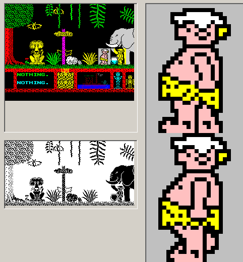 Но это еще не конец. Надо перебрать все процедуры после отрисовки Валли до момента копирования теневого экрана в основной. И отследить кто может "испортить" нашего Валли. А это всякие столбы, трава по пояс, которые ближе к нам и должны перекрывать Валли. Т.е. мы должны отслеживать их отрисовку и в случае совпадения положения экране - корректировать слой маски - обнулять байты в этом месте. Тогда видеоконтроллер покажет в этом месте фон, где действительно нарисованы трава или столб. Эти объекты хороши тем что они расположены строго по знакоместам и можно не заморачиваясь просто обнулять целый байт маски. Но еще есть мелкие предметы (всякие котелки, тапки и проч.), которые отрисовываются как спрайты со своей маской, а они любой формы и к примеру в дырочку под ручкой котелка должен просвечивать Валли. А это значит нужна более сложная операция при отрисовке: сначала считываем данные слоя маски, потом обнуляем те биты что закрываются котелком (перемножаем маски) и пишем байт назад в слой маски.