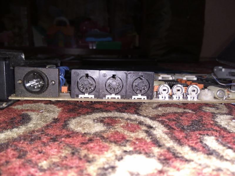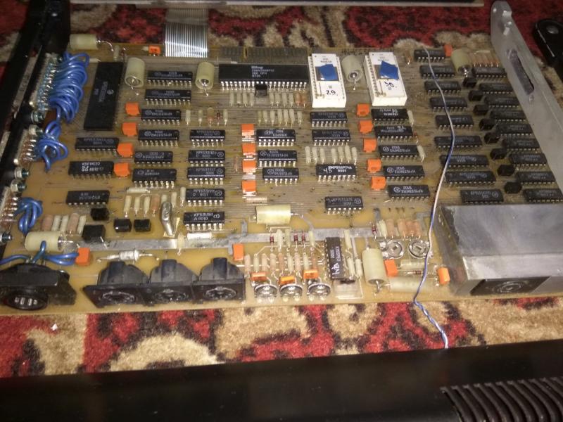 В отличие от описанного выше - для джойстиков установлены семиконтактные гнездаа "DIN", интерфейсный разъем не установлен. На противоположной стенке разъем для соединения шлейфом с блоком питания/дисководом. Контроллер дисковода разделен пополам - половина в основном блоке, половина рядом с дисководом.