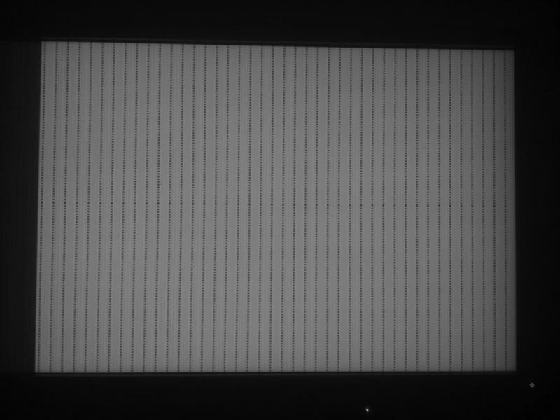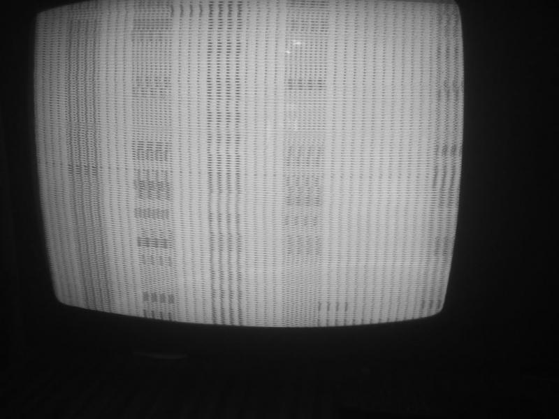 Добился устойчивого кадра. Телевизору не нравился почему-то выходной конденсатор (замена на другой, заведомо годный, не помогла). Пока закоротил и добавил сопротивление 680 Ом. Сейчас все с процессором выглядит так. Дальше нужен по-хорошему осциллограф и тестовое ПЗУ. Может картинка специалистам по специалистам знакомой окажется? Иногда при вкл/выкл появляются какие-то дополнительные черточки и штрихи, но основа такая же. Пунктиры сверху-вниз и двойные пунктиры посередине. Без процессора матрас равномерный - полосы сплошные.
