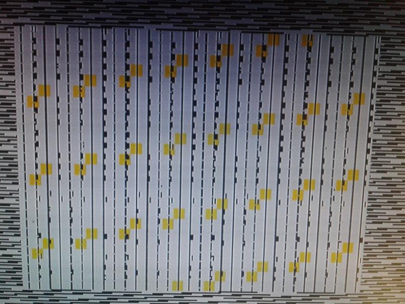 здесь надо бы уточнить, что они будут в 0 по окончанию заполнения 0ми и все три 1цы по окончанию заполнения 1цами, т.к. изображение строится динамически, то сигналы будут менятся в процессе заполнения. теперь сигналы на 9-12-15 выводах D42. но вообще, судя по картинке заполнения белыми линиями, память у вас сыпется. возможно регенерация не правильная. как минимум VD3 всё еще глючит, хотя и не всегда. если бы был постоянно в 0 (вертикальные линии без штрихов), тогда можно было говорить о битой рушке на VD3 или дорожке дальше к ир16 и ир23. также наблюдаются и другие проблемные микросхемы памяти, судя по кол-ву глючных пикселей на одно знакоместо, причем хаотичное. проверьте 3, 4 и 15 выводы рушек пробником (хотя там лучше осцилом), оба светодиода должны светится.