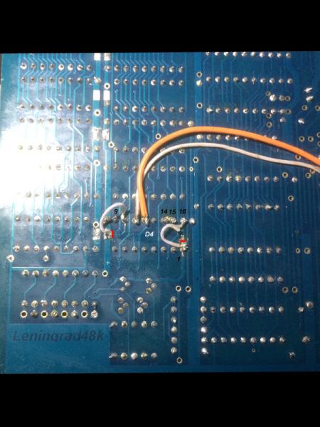 Доброго всем дня! Прошу помощи в запуске Ленинграда-1. На просторах интернета была приобретена плата Ленинграда 48К, частично собрана. Собрав все недостающее принялся запускать. На плате м/с D4 были следующие изменения: отрезаны дорожка от D4.16 к D4.1 и дорожка от D4.10 к +5В (отмечены красной линией на фото), вместо этого установлены перемычки между D4.14 и D4.15 и от них установлена перемычка к D4.1 ( на D4.1 был -5В), а также стояла перемычка от D4.10 к -5В. Да забыл сказать кварц на плате стоит на 14Мгц. При таком положении перемычек на экране ни чего не отображается. Подключал через RGB SYNC к PAL кодеру (от nedopc). Просто синий экран AV, как будто нет сигнала. Решил все перемычки поставить в соответствии со схемой данной печатной платы, (фото с перемычками в настоящий момент) и тоже такая картина, ничего не отображается. Буду рад если посоветуете в каком направлении двигаться. Спасибо!![]()