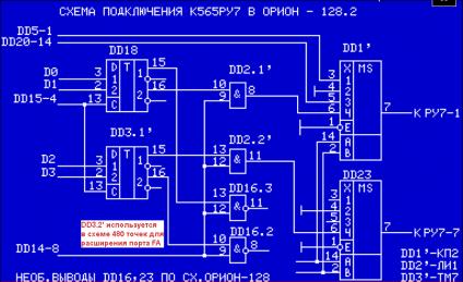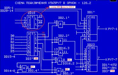 Сейчас ОЗУ в варианте с РУ7 набирается блоками по 256кб. Блоки управляются DD29 (ИД4, все номера по журнальной схеме), с нее выходят сигналы управления нашими двумя модулями (256+256=512кб) и расширением до 1024кб (сигналы КТ1..КТ4 в журнальной схеме, тут их подавать некуда, а вот в ревизии 512 это дополнительная плата ОЗУ вторым этажом - вторые 512кб). В случае использования двух планок SRAM по 512к (это проще чем одна на 1024 - более универсально с РУ7 по разводке управления памяти свыше 256кб) DD16.2 отрезать от ИД4 (а тот вход ИД4 пересадить на +5) а сигнал A19 заводится в параллель на обе планки и подается на ножки A18 (самые старшие) тамошних SRAM-ок. Остальные ножки SRAM-ок (A0..A17) и сигналы управления (W, OE) берут от РУ7,АП6 и с регистра-защелки половинки адреса (ХЗ что там защелкивать - CAS или RAS).