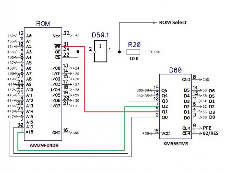 /WE (нога 31) у 27080 является адресом A18 (Q2=D2), а вывод 1 сигналом A19 (Q3=D3).