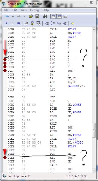 Вот к примеру код трасировал в спектакуляторе. До команд с точками остановки программа не доходит никогда. А до команд которые стоят перед ними доходит. Как так? Что заставляет процессор бросить выполнять пограмму на пол пути? Красными стрелками я отметил где программа ещё вы полняется, а до отмеченых точек остановки не доходит. Я понимаю если бы там были команды переходов, но там INC E несколько штук. А в следующм месте POP DE.