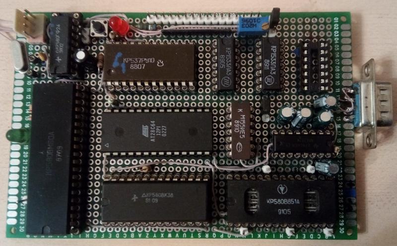Вот простейший "монитор", который я для нее написал. Работает он через последовательный порт. Его основная функция - загрузка файлов через терминал в ОЗУ и запуск программ с адреса 8000h. Кроме того имеются подпрограммы ввода и вывода. Ввод с использованием прерываний и аппаратным управлением потоком.