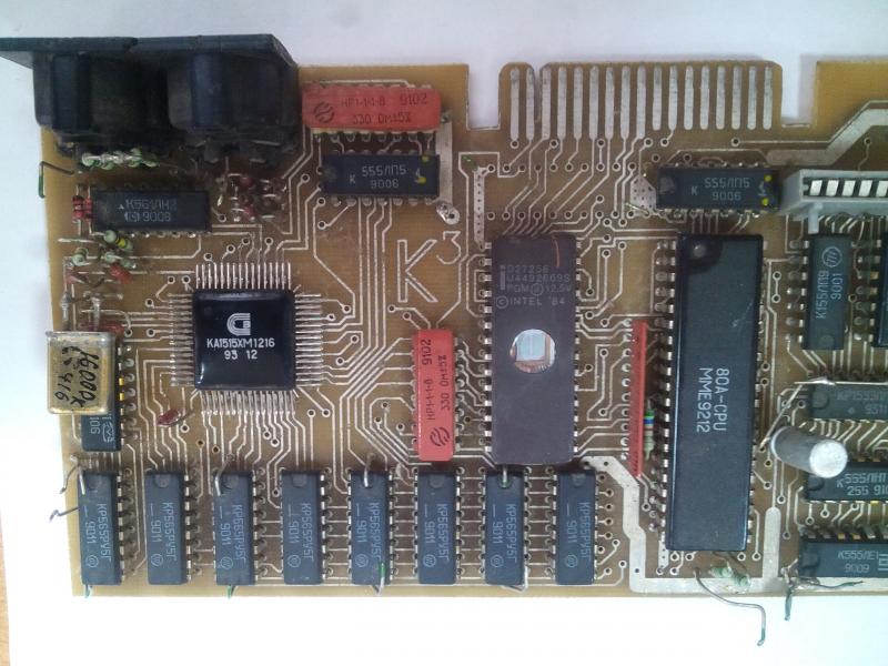 Смотрю просмотров достаточное количество, но никто не высказал свох предположений. По ходу дела прошу подсказывать, какой разьем для чего может быть. Размер платы при таком вооружении впечатляет: 265*90 мм. Вчера методом ""научного тыка" определил, что на общем фото второй от края разьем слева - это Sinclair. Контакты первого слева разьема соединены через резисторы 1,2 ком и выходят на контакты 3,6,10,13 мс КР1533КП 11А. Что это может быть за разьем? Контакт 1 первого гнезда справа выходит через делитель из резисторов на 5,6 ком на 4 ногу мс К561ЛН2, а 3 и 5 контакт через резисторы 5,6-5,9 ком на 12 ногу мс к555ЛН1. Что это может быть за разьем?